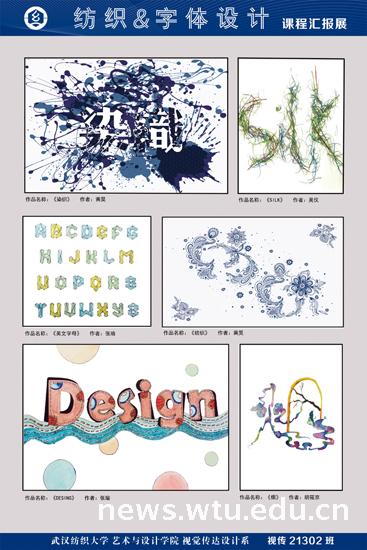 《字体设计》是视觉传达设计专业的基础课程,共36个课时。该课程开设以来,除了在设计教学过程中注意培养员工的专业理论知识和设计能力外,每年还会根据不同的设计“主题”来加强员工的研究方法与思维创新能力。视觉传达设计系主任曹刚介绍:“今年,该课程以‘纺织’为主题,在展览的作品中,既有平面字体设计也有利用纺织材料进行后期加工的设计作品,在艺术风格和艺术表现手法上呈现出不同材料‘亲密接触’的奇特效果和不同作品的艺术创新。”